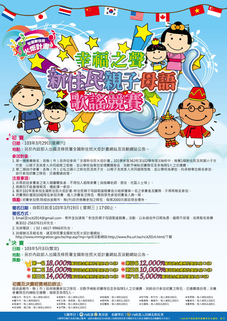 由移民署舉辦之"全國新住民火炬計畫-新住民親子母歌謠競賽"開始報名囉!